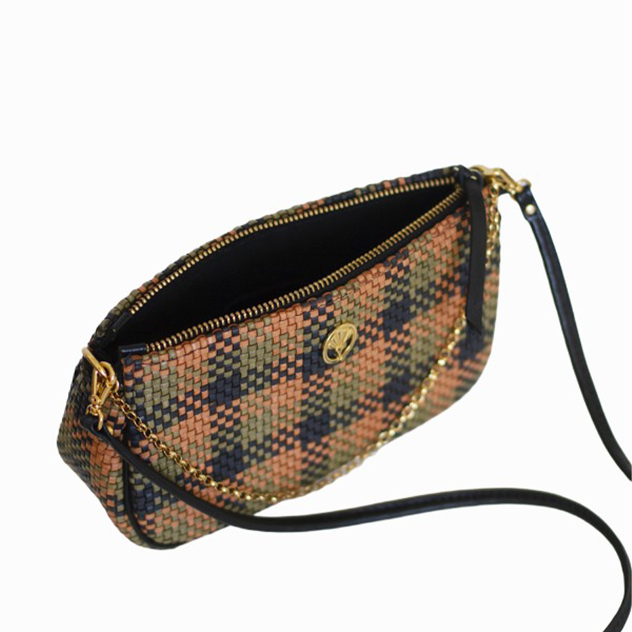 Leather, straw/raffia and chain.