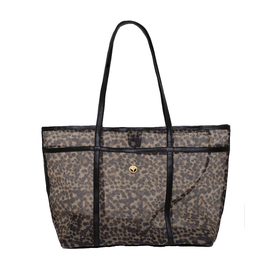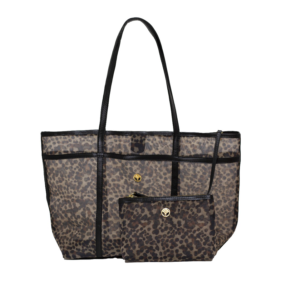 Bolsa em nylon com alça couro, estampa animal print e necessaire interna que vira uma bolsinha de mão.