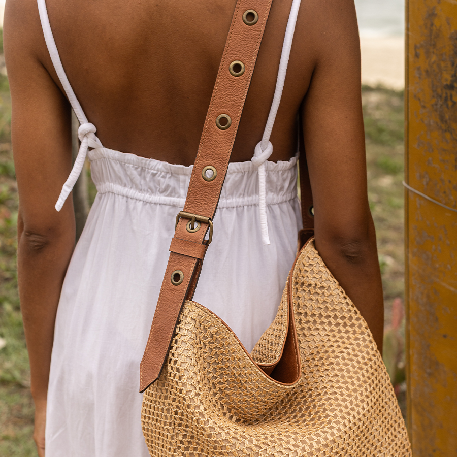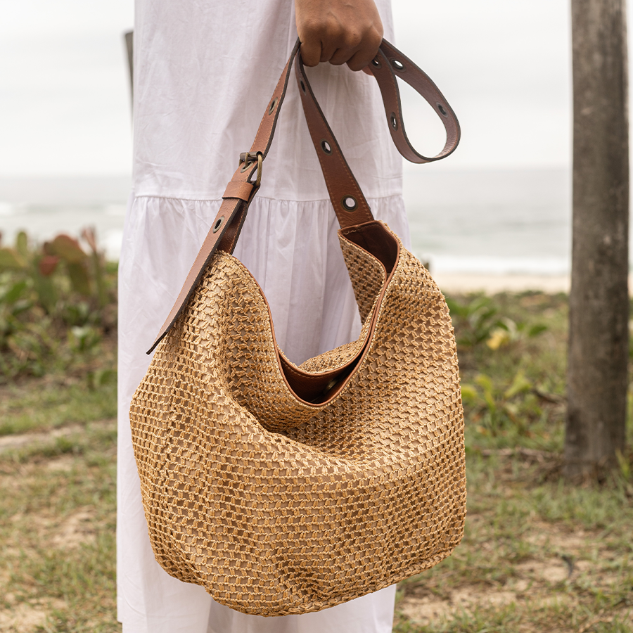 Bolsa saco com alça de ombro regulável, detalhes em ilhós feita em ráfia tela.